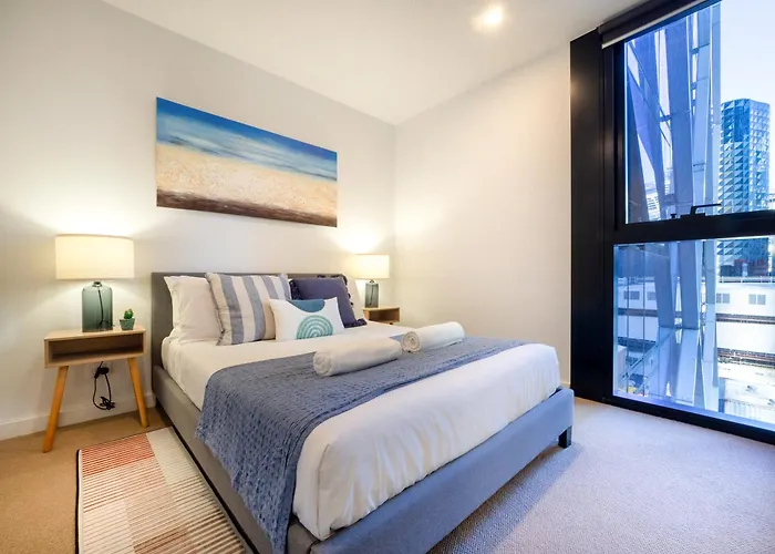 这家59平方米的公寓设有大厨房. 步行到A'Beckett Street/Queen Street巴士站需要5分钟. 客人可以在游泳池游泳.